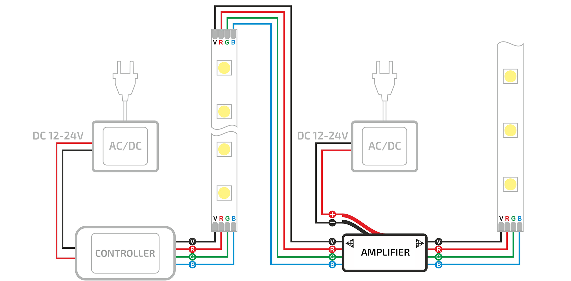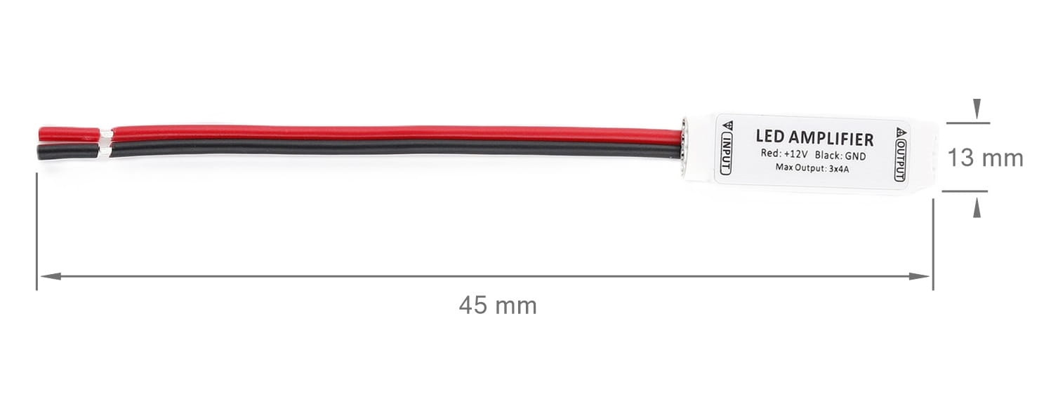 Amplificator pentru bandă LED: tensiunea de intrare/ieșire DC 12-24V | Sarcina maximă de funcționare 6A | Gradul de protecție: IP20 | Domeniul de utilizare: bandă LED RGB