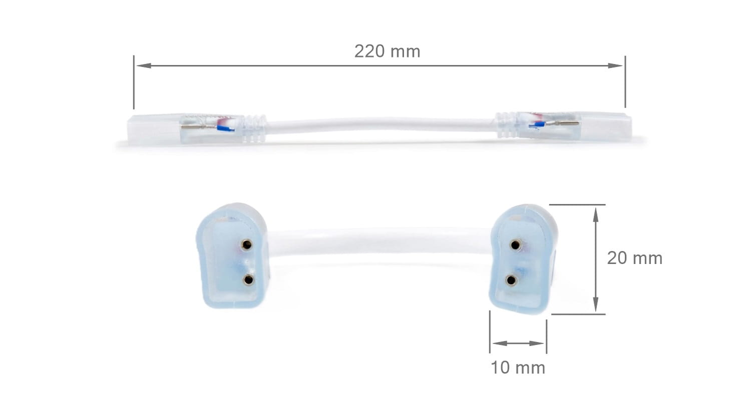 Conectorul pentru benzi LED Neon are dimensiuni de 220 x 20 x 10 [mm], ceea ce îl face un element compact și funcțional al instalației de iluminat. Lungimea sa permite conectarea ușoară și sigură a două secțiuni de bandă LED, fără necesitatea utilizării unor unelte sau materiale suplimentare. Dimensiunile compacte ale conectorului permit plasarea discretă în diverse locații ale instalației, fără a afecta negativ estetica întregului proiect de iluminat.