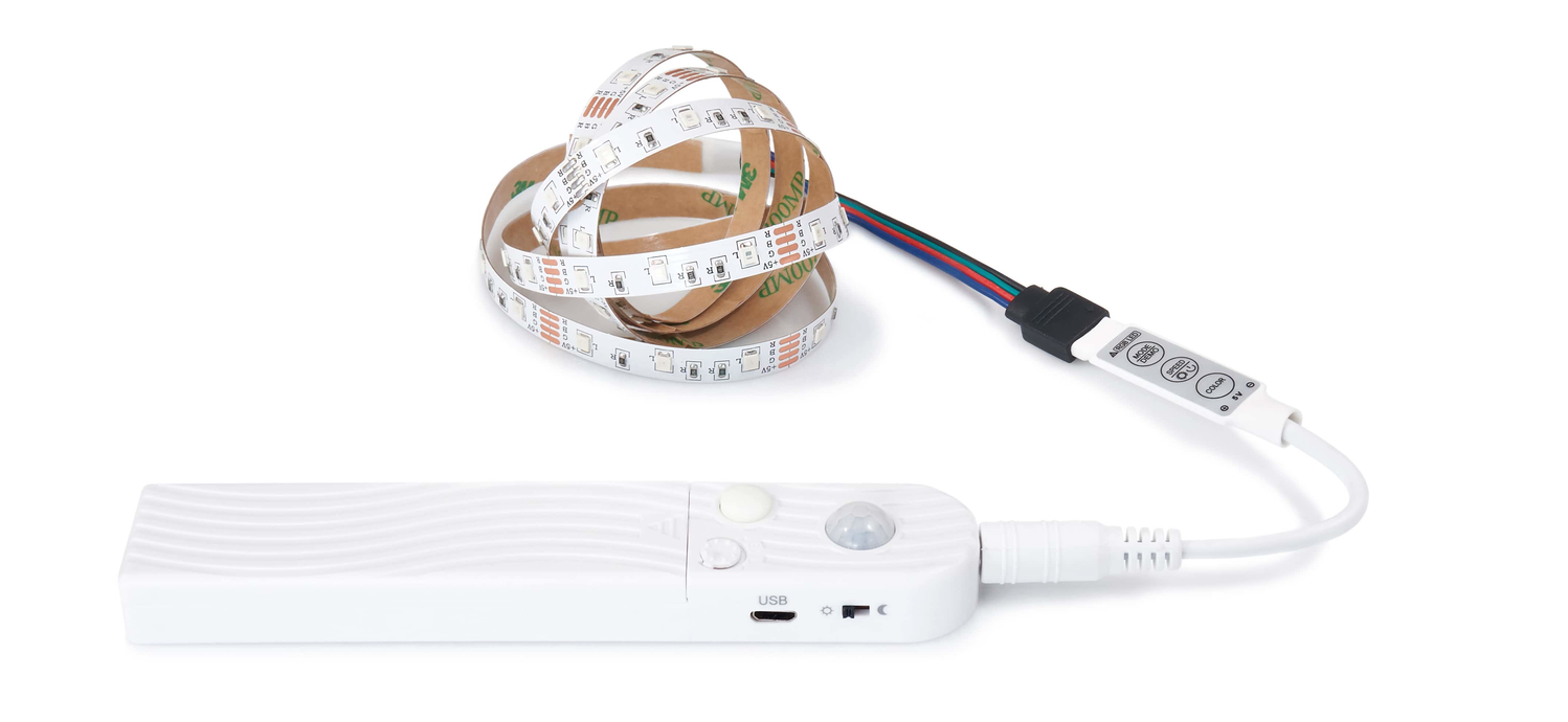 Set bandă LED RGB 5V 1m + controler cu senzor de mișcare și crepuscul pe baterii AAA este o soluție inovatoare care oferă nu doar iluminare, ci și funcții de pornire și oprire automată în funcție de condițiile ambientale. Proiectat pentru confort și economie de energie, acest set de bandă LED este perfect pentru diverse aplicații interioare.