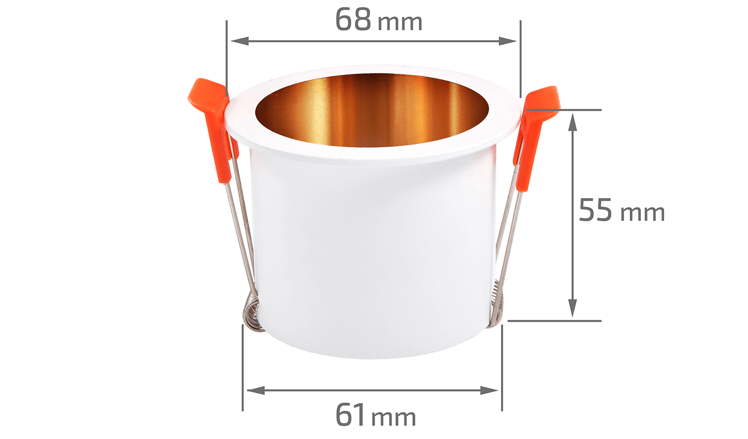 Corpul de iluminat halogen îngropat fix din aluminiu LED Deep Mila – Alb/Aur are dimensiuni standard, care permit montarea și integrarea ușoară în diferite tipuri de interioare. Corpul de iluminat are următoarele dimensiuni: Φ68x55 [mm]. Diametrul orificiului de montaj: 61 [mm]. Aceste dimensiuni permit o instalare flexibilă și fac ca corpul de iluminat să nu ocupe mult spațiu.