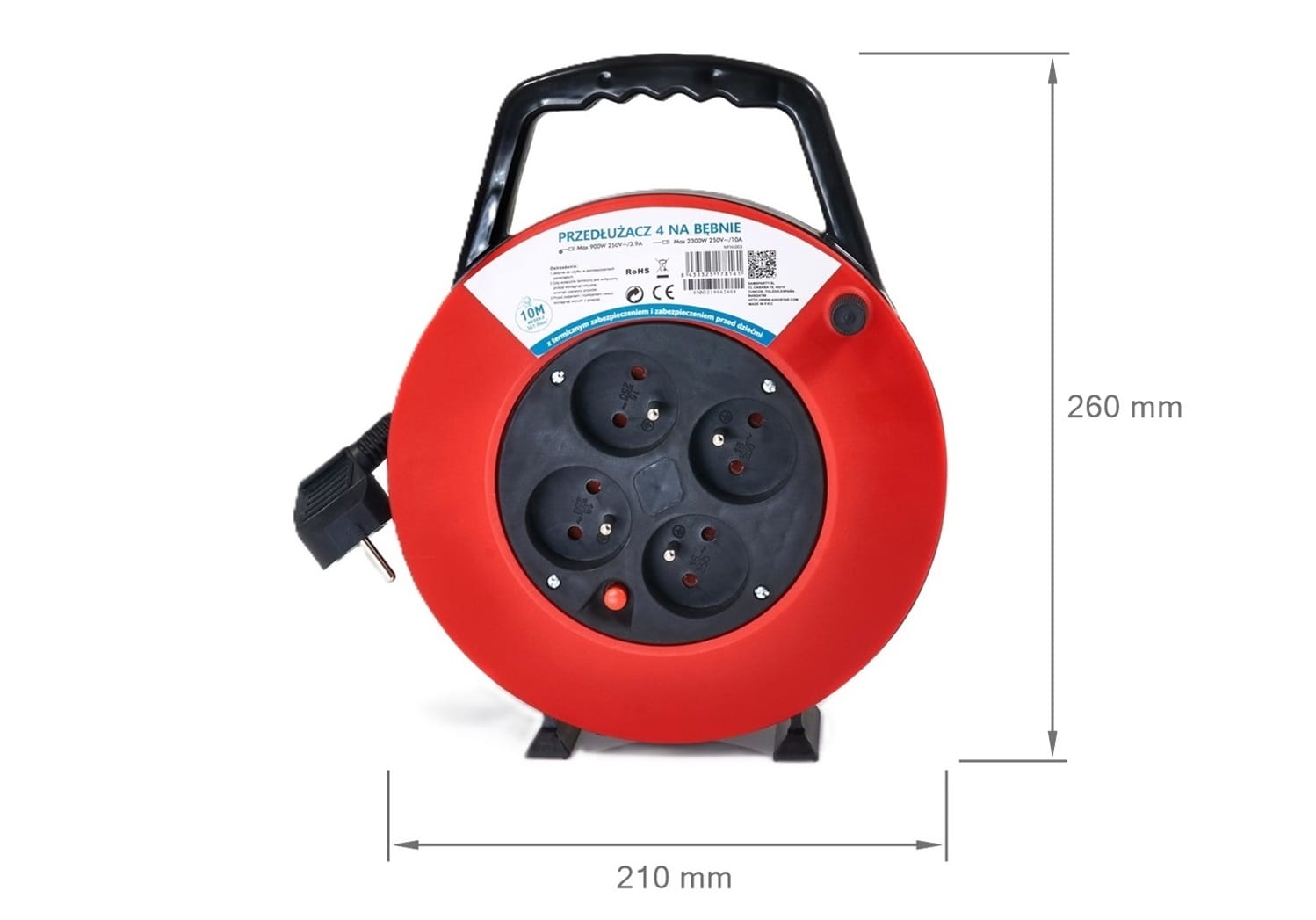 Prelungitorul tambur se caracterizează prin dimensiuni compacte, care facilitează depozitarea și utilizarea acestuia. Datorită mânerului ergonomic, prelungitorul este ușor de transportat, iar construcția sa stabilă îl face rezistent la răsturnări chiar și în timpul utilizării intense. Lungimea cablului de 10 metri este optimă pentru majoritatea aplicațiilor.