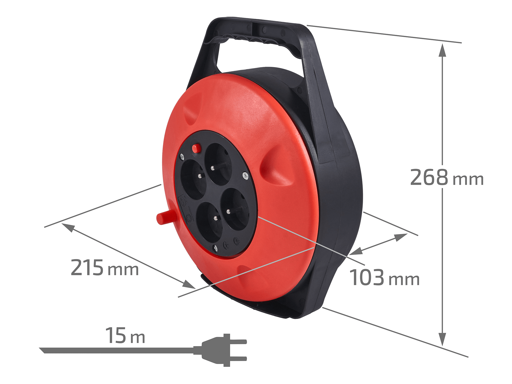 Prelungitorul are o lungime de 15 metri, ceea ce oferă o valoare optimă pentru manevrarea liberă a cablului. Această lungime este suficientă pentru a ajunge în locuri greu accesibile, evitând în același timp încurcarea cablurilor. Designul compact al tamburului permite depozitarea și transportul ușor al prelungitorului. Datorită mânerului solid, acesta poate fi mutat cu ușurință dintr-un loc în altul.