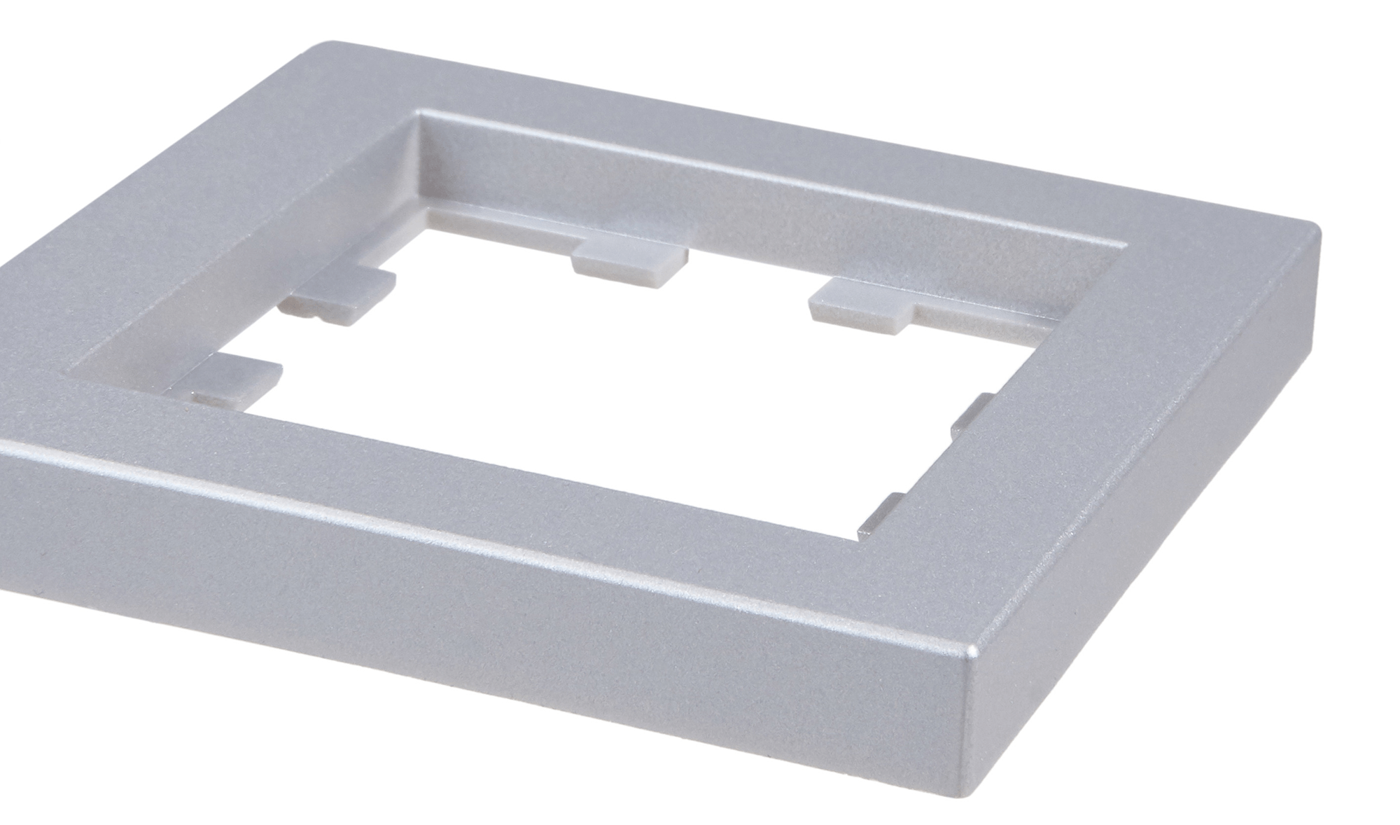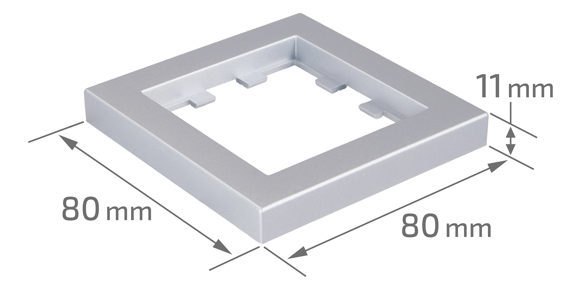 Ramă Schrack EV125301 din seria VISIO S 55 este o soluție estetică și modernă pentru un singur punct de instalare. Forma sa simetrică și pătrată (80×80×10 mm) și finisajul argintiu din linia CUBIC o fac perfectă pentru interiorurile de stil modern, tehnic și minimalist – atât în spațiile rezidențiale, cât și comerciale.