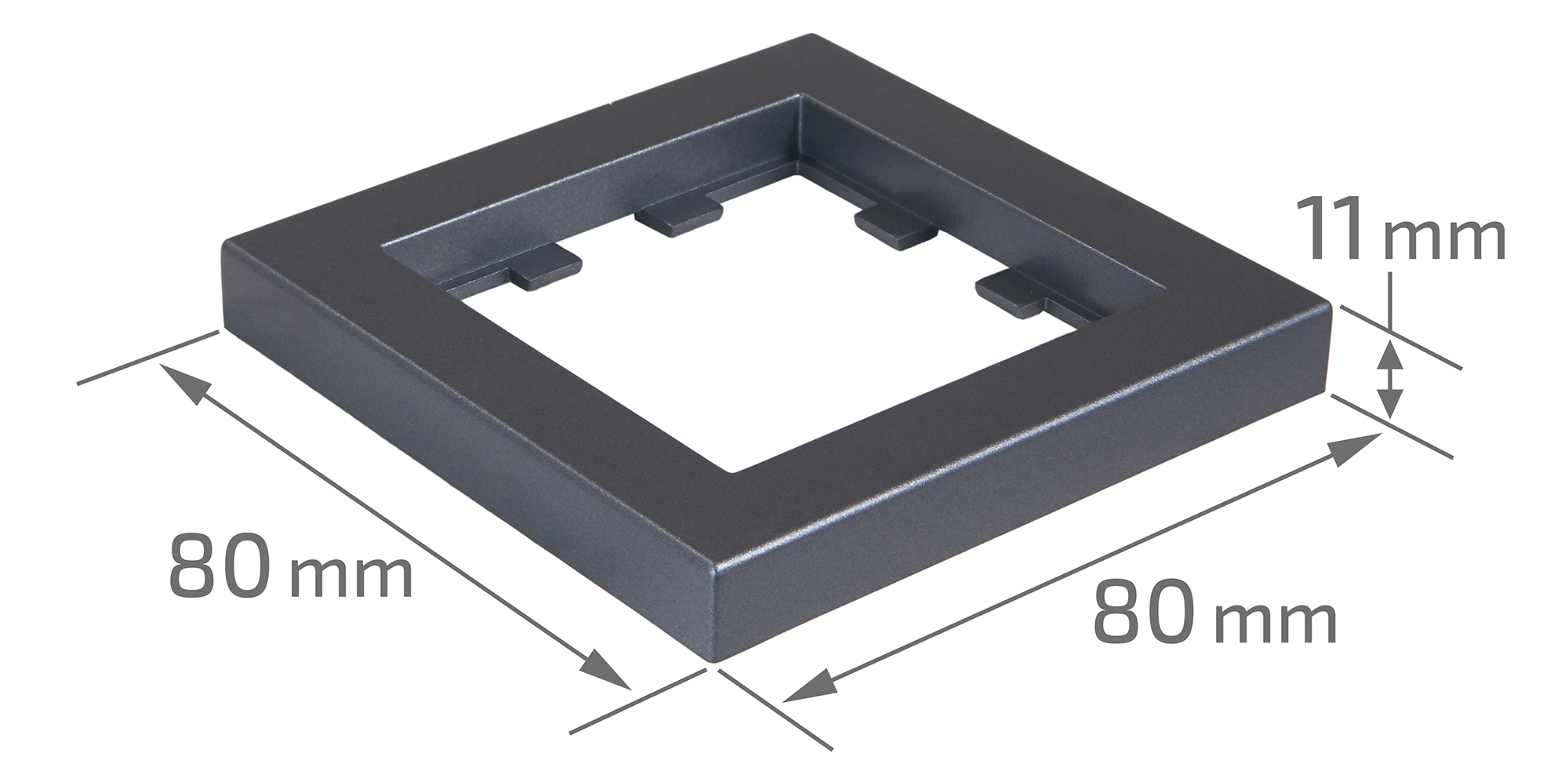 Ramă are dimensiunile 80 × 80 × 11 mm, ceea ce permite integrarea estetică a acesteia în perete fără margini proeminente. Forma subțire și grosimea redusă asigură o conexiune armonioasă cu suprafața tencuielii, creând un ansamblu uniform și ordonat.