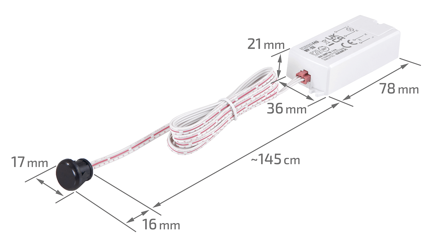 Dispozitivul are dimensiuni compacte: lungimea totală este de 145 cm, lățimea carcasei este de 78 mm, iar înălțimea de doar 21 mm, făcându-l discret și neintruziv în estetică camerei. Procesul de instalare este simplu datorită elementelor de montaj incluse și poate fi realizat de sine stătător, fără a necesita un specialist. Lungimea cablului (1500 mm) oferă o mare flexibilitate în montare și permite amplasarea comutatorului în locul optim.