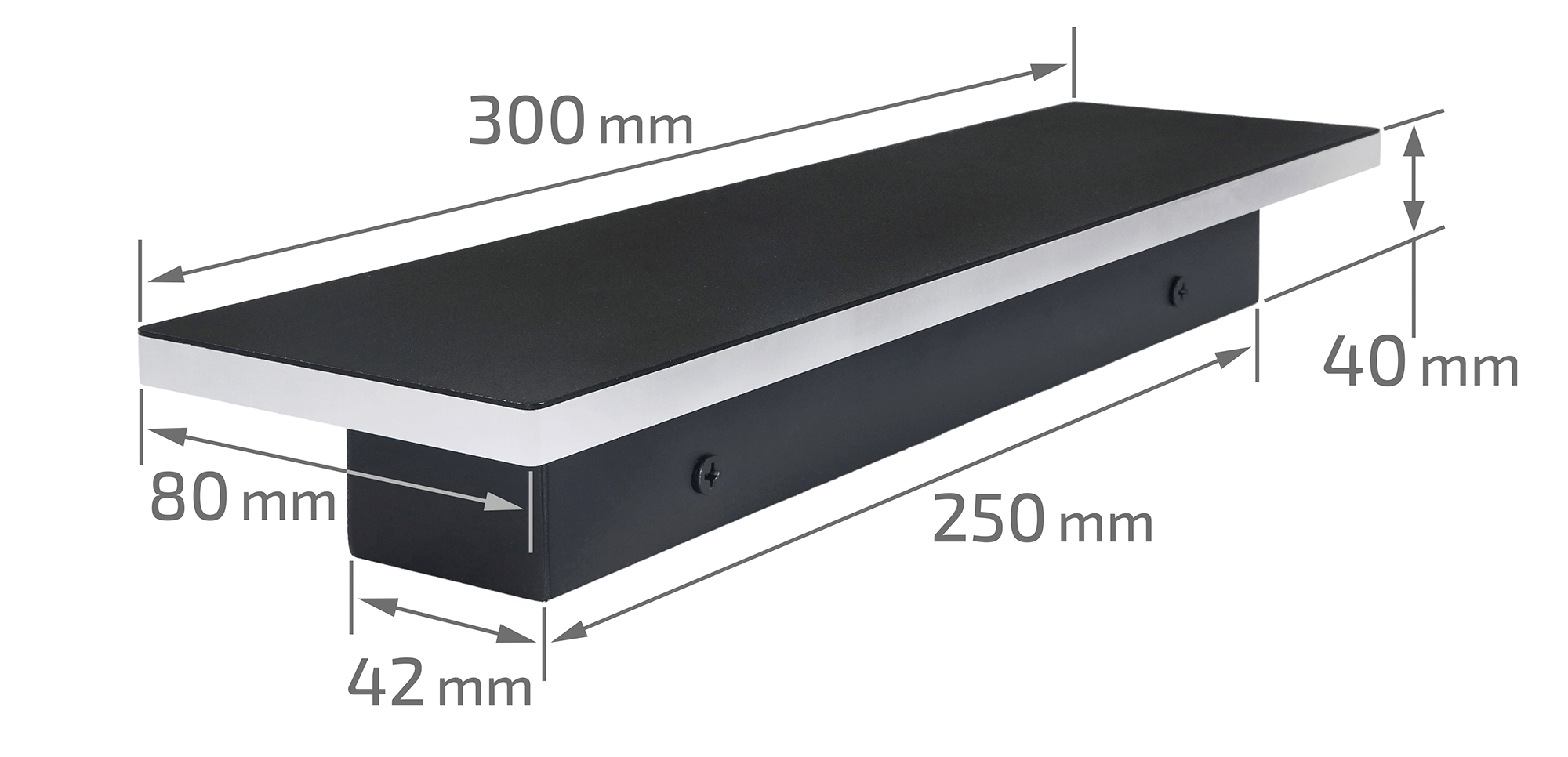 Lampa are următoarele dimensiuni: lungime 300 mm, lățime 80 mm, adâncime 45 mm. Baza de montaj din spate are o lungime de 250 mm și o înălțime de 42 mm. Această configurație permite o fixare apropiată de perete, menținând un aspect subtil și modern, fără a domina vizual spațiul.