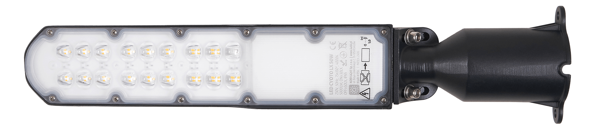 Lampa LED CYOTO LX 50W IP65 este folosită în multe locuri, de la străzi și drumuri, la parcări și piețe, până la spații industriale. Versatilitatea sa face posibil montajul atât vertical cât și orizontal pe stâlpi și brațe de dimensiune Ø60 mm, cu posibilitatea de reglare a unghiului de ±15°. Senzorul de amurg încorporat pornește automat iluminatul atunci când intensitatea luminii scade sub 30 lx și îl oprește când aceasta crește peste 50 lx.