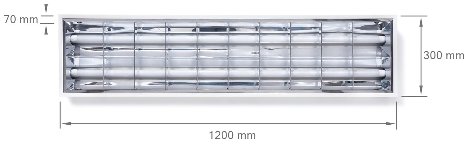 Setul: 1x Corp raster montat la suprafață 2x120cm + 2x Tub LED 18W - Alb neutru (4500K) are dimensiuni impresionante de 1200x300x70 [mm], ceea ce îl face o iluminare excelentă pentru spații mai mari. Construcția lungă permite distribuirea uniformă a luminii, eliminând umbrele și zonele slab iluminate.