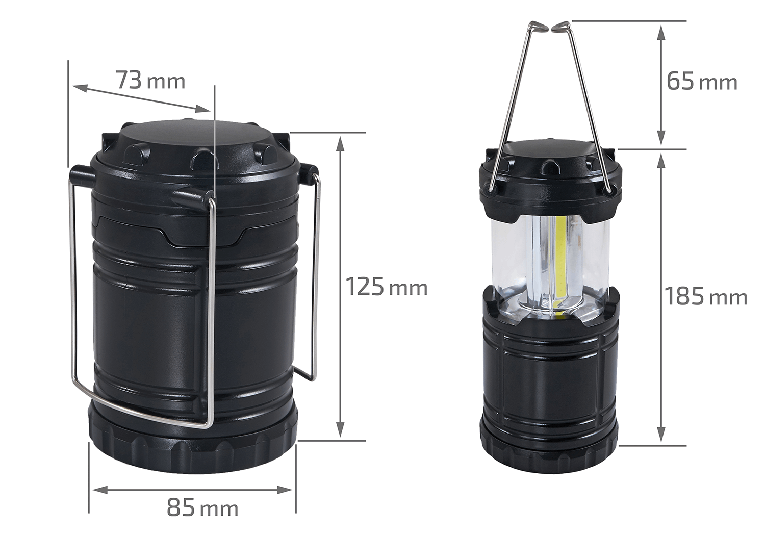 Când nu este utilizată, poate fi pliată până la dimensiuni compacte de 125x85x85 mm, facilitând ambalarea și depozitarea. Odată desfăcută, atinge o înălțime de 180 mm, menținând diametrul bazei de 85 mm, ceea ce asigură o bază stabilă pe diverse suprafețe. Raza de acțiune a luminii lanternei variază între 5 și 10 metri, suficient pentru a ilumina un sit de camping sau o cameră mică.