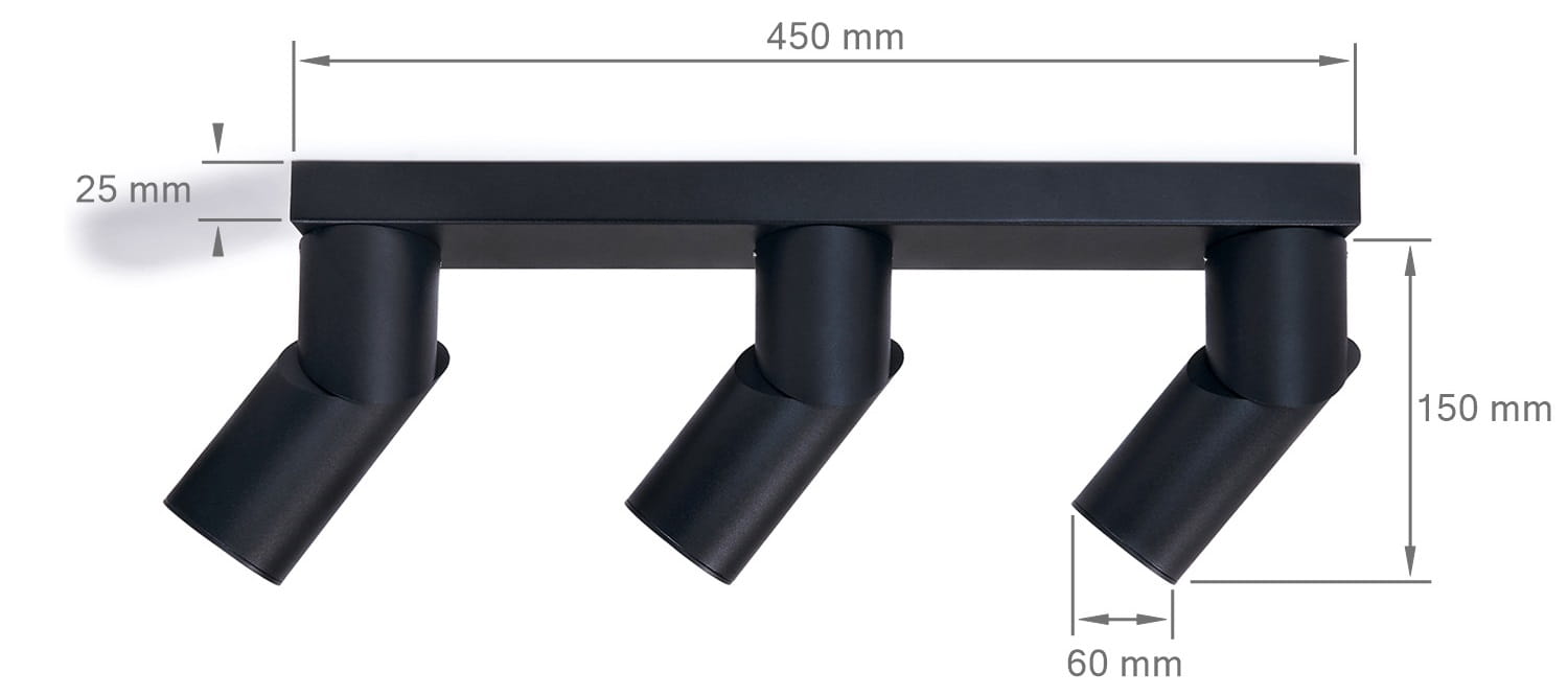 Dimensiunile acestei aplici sunt adaptate funcției sale ca iluminat suprapus pe tavan. RITA APLICA HALOGENĂ X3 NEGRU LINIE are dimensiunile bazei: 450x60x25 [mm]. Dimensiunile externe, adică dimensiunile tubului, sunt: φ60x150 [mm]. Datorită acestor dimensiuni, aplica este ușor de montat pe tavan, iar designul său modern o face să se integreze elegant în diferite aranjamente interioare.