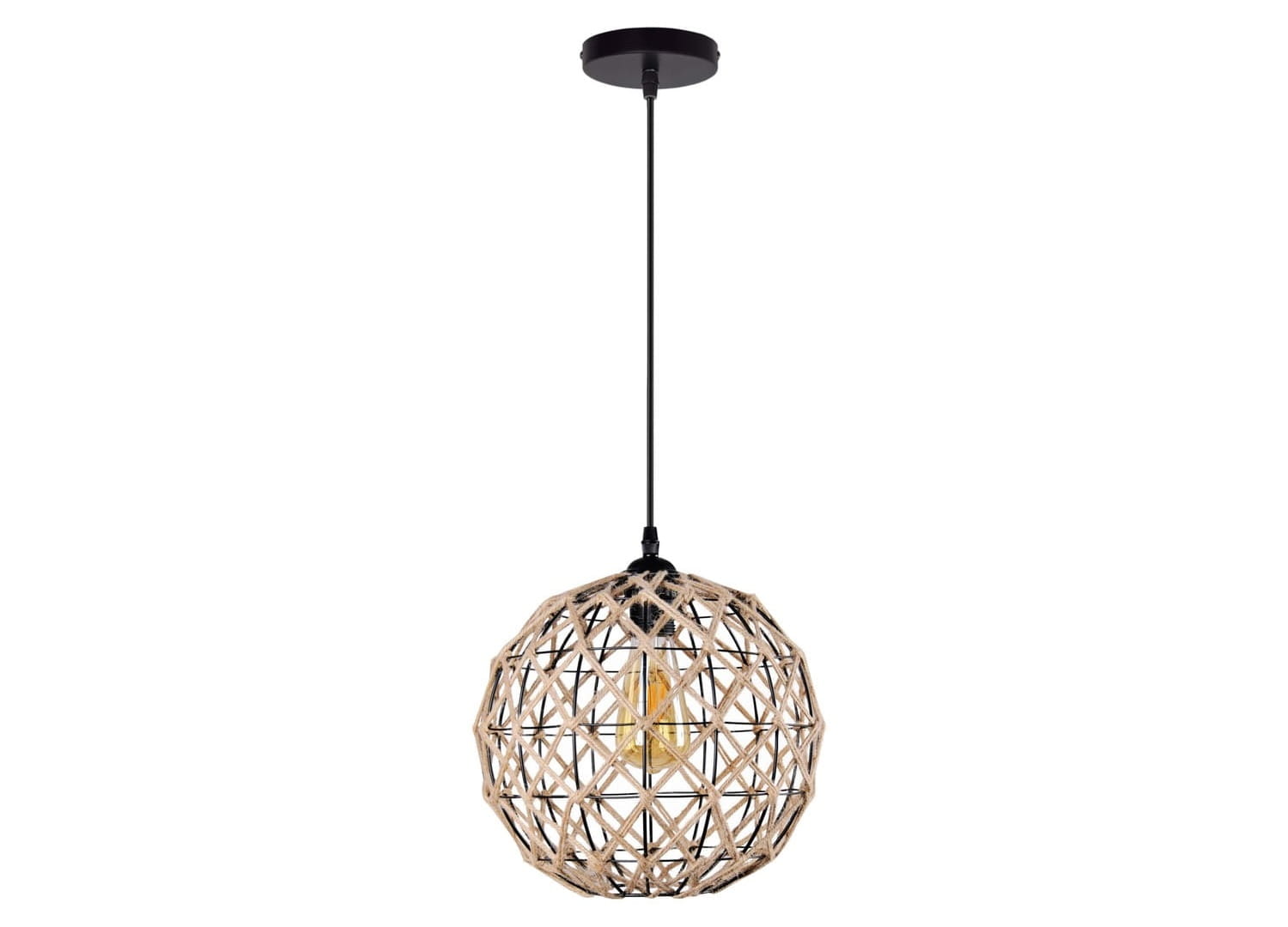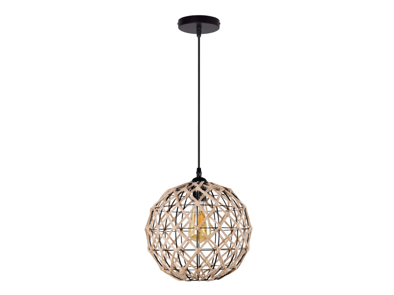 Lampă pandantiv cu aspect casual, cu un abajur în formă de minge realizat dintr-un șir elegant în culoare bej, care este intercalat cu sârmă neagră