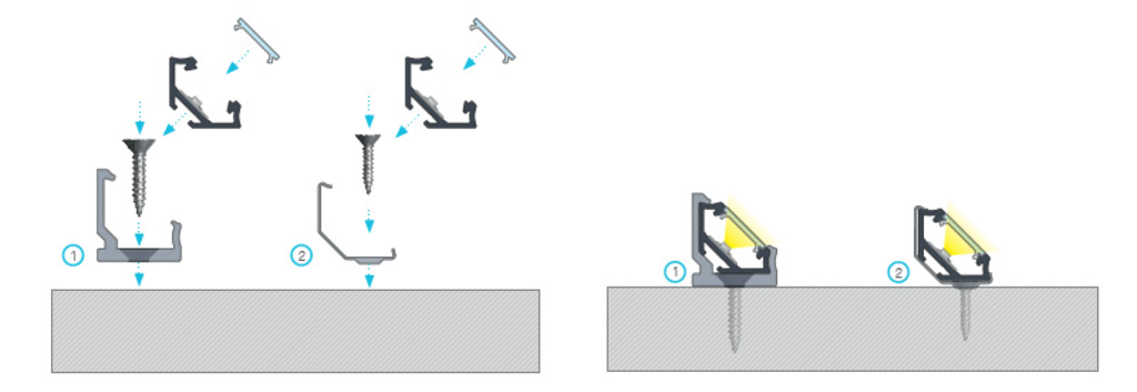 Suprafața pe care va fi instalat profilul trebuie pregătită în prealabil, pentru a fi liberă de diverse impurități. Apoi, plasați banda în interiorul profilului și folosiți bandă dublu adezivă, adeziv sau suporturi de montaj pentru a fixa profilul pe suprafața aleasă.