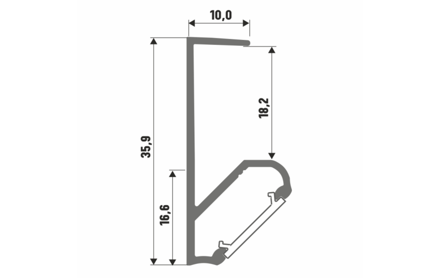 Profilul de aluminiu Q18 are dimensiunile de 10 [mm] x 35,9 [mm] (lățime x înălțime), fiind adecvat pentru montarea benzilor LED de diferite lungimi cu lățimea standard de 12 mm. Lungimea disponibilă de 1 metru facilitează adaptarea la proiectul specific de iluminat, oferind în același timp spațiu suficient pentru banda LED.