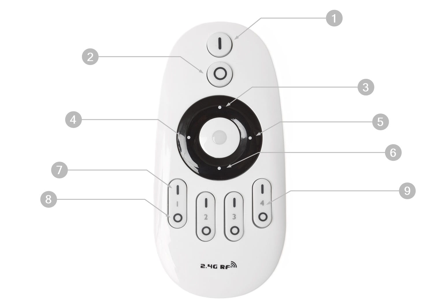 Telecomanda zonală utilizează tehnologia radio RF, ceea ce permite operarea fără a fi necesar să fie direcționată spre dispozitiv. Raza de acțiune de până la câteva zeci de metri permite controlul convenabil al iluminatului din orice loc al încăperii. Cu ajutorul celor patru zone independente, utilizatorul poate controla diferite zone de iluminat cu o singură telecomandă, ceea ce oferă o personalizare completă a setărilor.