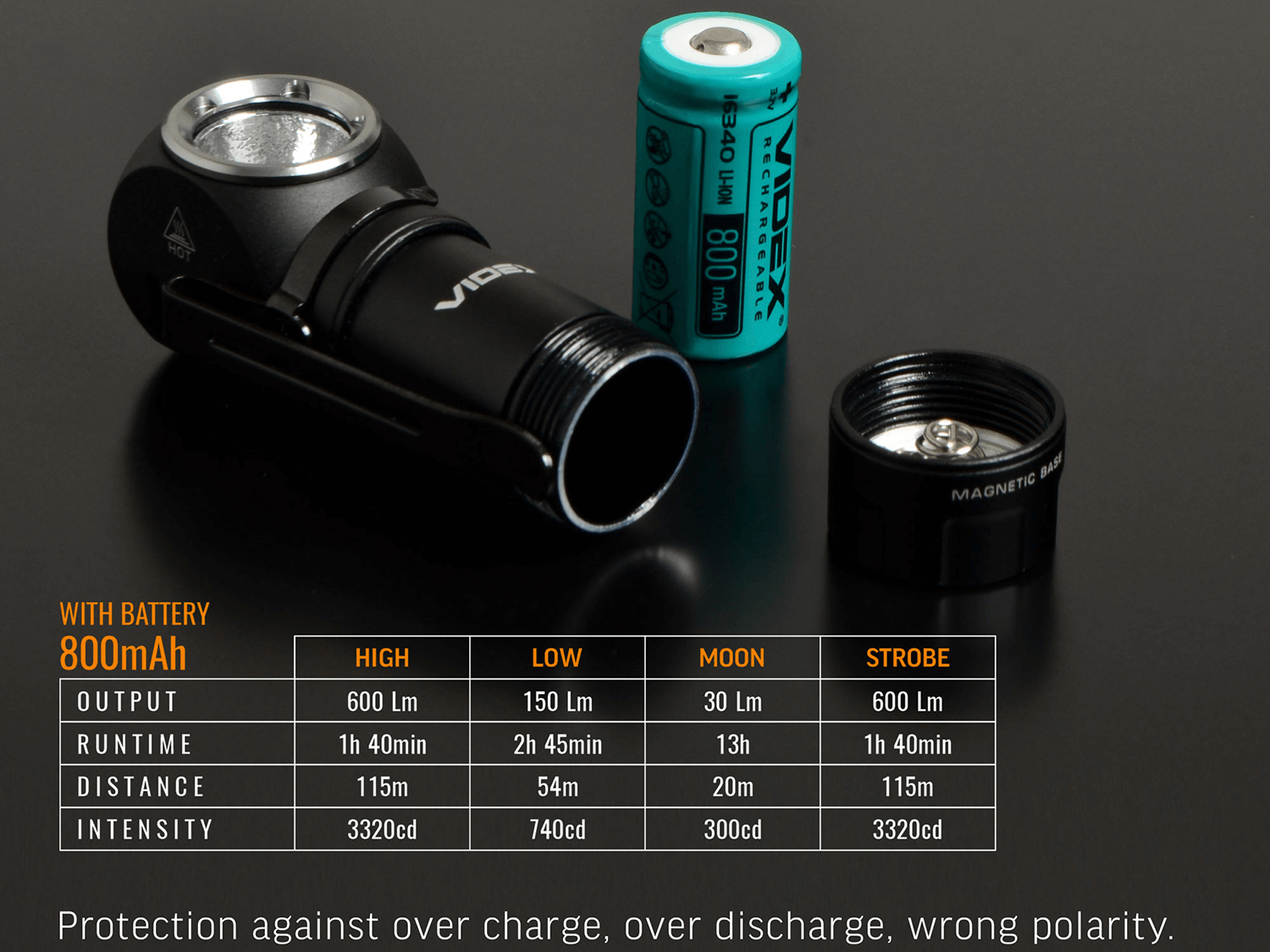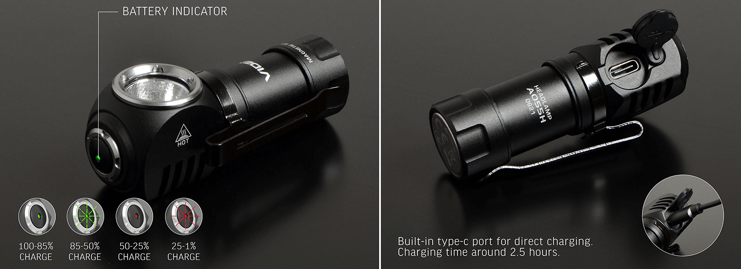 Lampa este alimentată de o baterie Li-ion eficientă de 16340 cu o tensiune de 3,7V și o capacitate de 800mAh. Acest lucru asigură o iluminare de lungă durată, iar indicatorul bateriei cu patru niveluri vă permite să monitorizați starea de încărcare a acesteia. Produsul are un port de încărcare încorporat, ceea ce vă permite să încărcați lampa cu ușurință și fără probleme, fără a fi necesară înlocuirea bateriei.