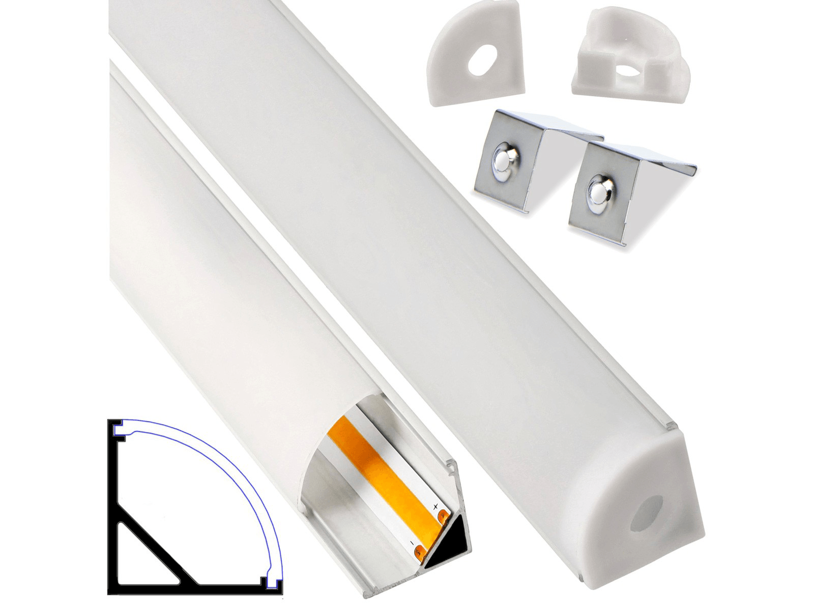• Setul conține profilul din aluminiu de 2 m, dispersorul mat, capetele terminale și suporturile de fixare.