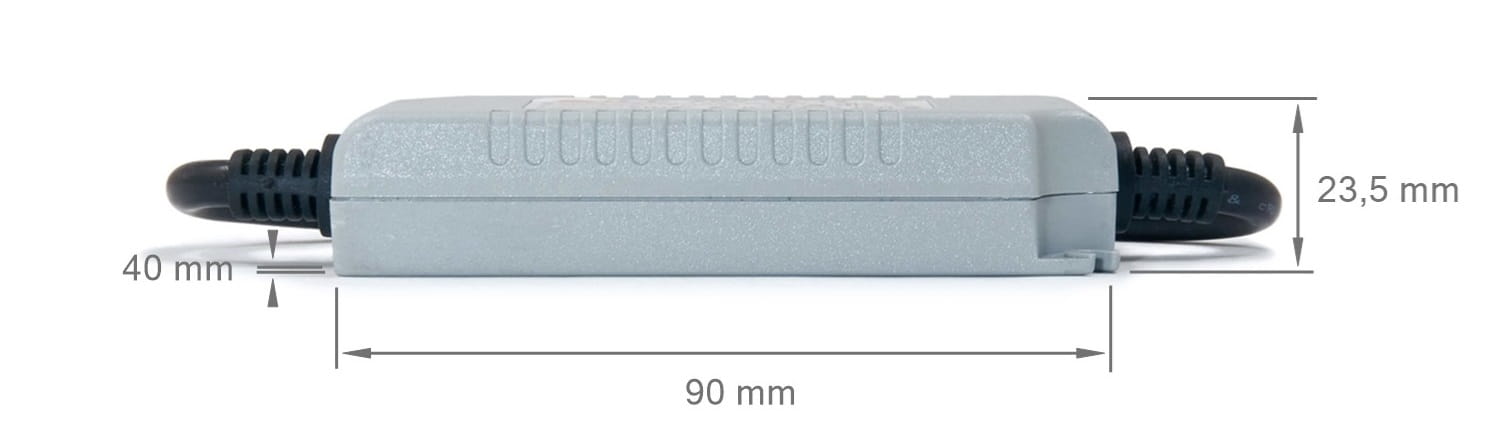 Sursa de alimentare se caracterizează prin dimensiuni compacte, ceea ce facilitează instalarea chiar și în spații cu acces limitat. Datorită dimensiunilor reduse, poate fi ușor montată în diferite locuri, asigurând o alimentare optimă pentru dispozitivele LED conectate. Dimensiunile produsului sunt: 90 x 40 x 23,5 [mm] (lung.x lat.x înălț.)